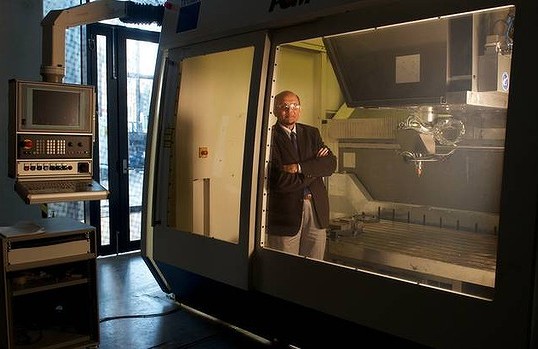 article: The printer is the size of a bedroom and dispenses metal instead of ink. Researchers at Swinburne University believe this 3D printing machine could help to save Australia's manufacturing industry. It prints metal objects in layers based on computer-designed plans. It can produce complex metal shapes in steel, chromium or cobalt that can be used in engineering materials. In the latest breakthrough Professor Syed Masood has developed a technique to dramatically speed up the process for manufacturing metal parts. The Age News Picture by Wayne Taylor 13th August 2012 Dr Syed Masood with a 3D printing machine at Swinburne Uni Hawthorn, which could help save manufacturing. An example of what the machine can do. Professor Masood has experimented with the composition of metal tools that manufacturers use to produce objects such as car components. He has used the Direct Metal Deposition machine to combine copper and steel in new quantities and layers, allowing molten metal tools to cool down much faster than was previously possible. This slashes lengthy waiting periods from the process of producing metal parts. |