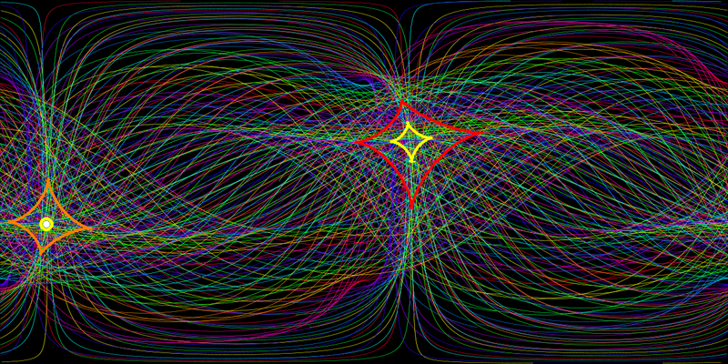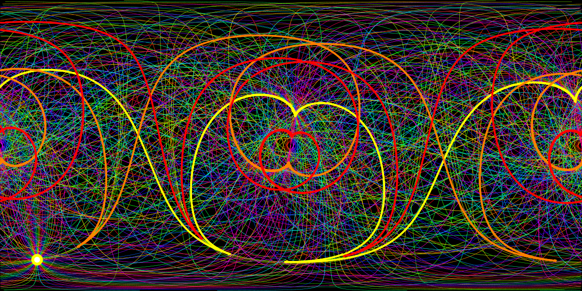 100 geodesics of the 6000 computed geodesics have been drawn. The picture was computed by solving the geodesic equations