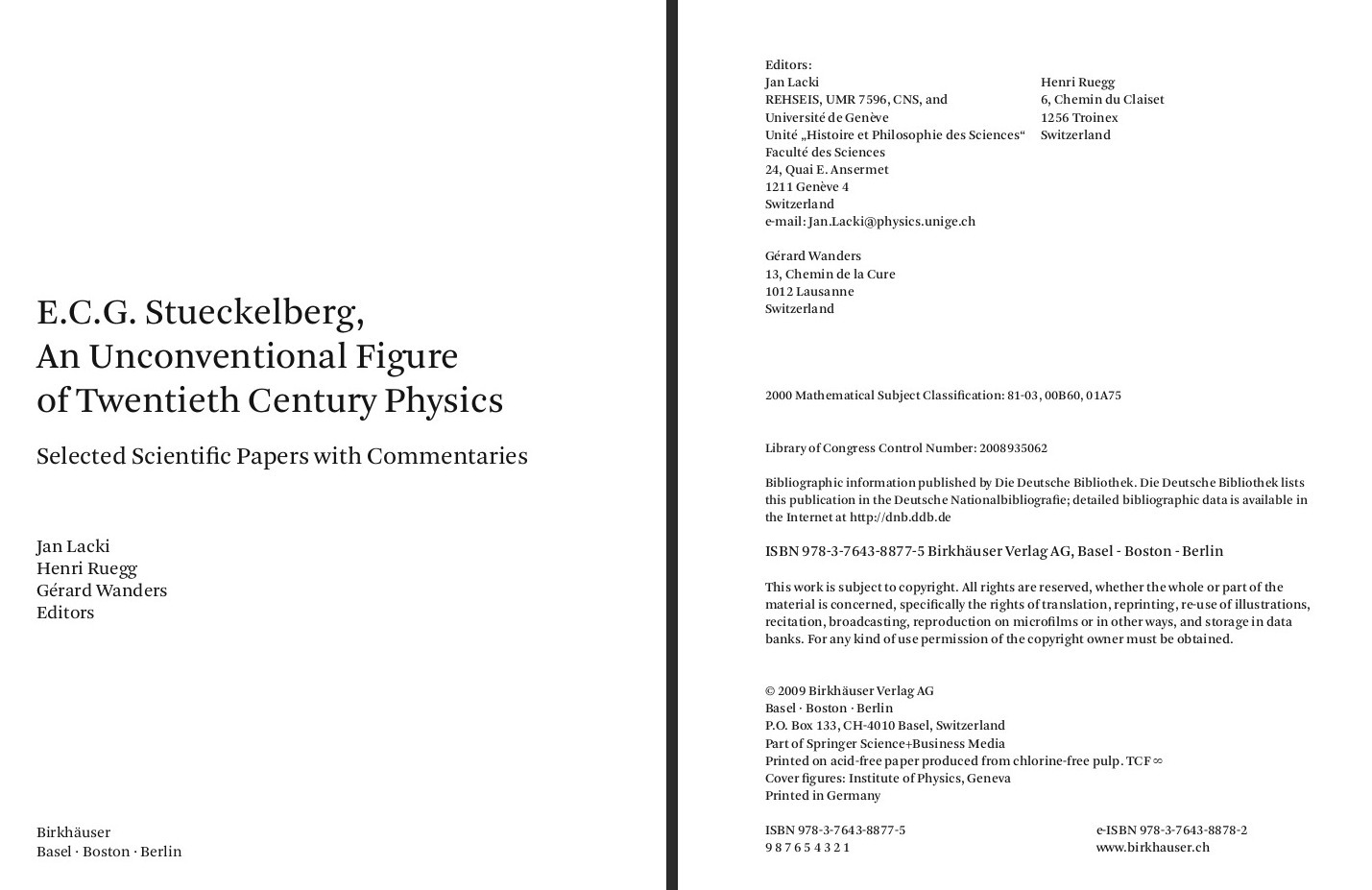 Overview of Stueckelberg's Life as a ScientistGerard WandersErnst Carl Gerlach Stueckelberg was born in Basel on February 1, 1905. His full name was: Johann Melchior Ernst Karl Gerlach Stueckelberg, Freiherr von Breidenbach zu Breidenstein und Melsbach. He inherited his German title from his mother's family. His father was a lawyer and his paternal grandfather was a well-known Swiss painter. At secondary school, the young Stueckelberg was a very gifted student. He obtained his "Matura" in 1923 and started to study physics at the University of Basel. As president of the Students' Union, he invited Arnold Sommerfeld, the eminent theoretical physicist, to give a talk in Basel. Sommerfeld accepted the invitation and was so impressed by Stueckelberg that he invited him to spend the academic year 1924-25 in Munich. The resulting stay in Munich was a crucial experience in Stueckelberg's life. He attended Sommerfeld's famous lectures in theoretical physics and discovered the early stages of quantum mechanics. He became also acquainted with Werner Heisenberg. Back home in Basel, Stueckelberg prepared his PhD thesis under A. Hagenbach's supervision. It is a rather unexceptional work on cathodes temperatures, both theoretical and experimental. He got his PhD in 1927 and also succeeded in becoming an officer in the Swiss army. At the end of 1927, Stueckelberg left for the United States. On Sommerfeld's recommendation he got a position as research associate at the prestigious Palmer Physical Laboratory in Princeton, led by K. T. Compton. There he worked on the quantum properties of molecules, a new subject, at the fore- front of research at that time. He was very efficient, collaborated with J. G. Winans and P. Morse and became assistant professor in 1930. In January 1932 Stueckelberg suffered from the first attack of a serious mental illness (manic-depressive psychosis) which would severely handicap him for the rest of his life. He felt unable to carry on with a scientific career in the United States, left Princeton and returned to Switzerland. A. Hagenbach managed to provide him with an assistant post at the University of Basel and, by the end of 1933, Stueckelberg was offered a position as "Privatdozent" at the University of Zürich. This put him in contact with two prominent leaders in theoretical physics, Wolfgang Pauli, at the ETHZ, and Gregor Wentzel, at Zürich University. He abandoned once and for all his previous research field and embarked on a completely new subject, the theory of elementary particles. As a mere "Privatdozent", Stueckelberg was faced with serious financial difficulties and he even contemplated a career in the army. But his situation improved at the end of 1934. After Arthur Schidlof's death, the University of Geneva asked Stueckelberg to take over the teaching of theoretical physics. Stueckelberg replaced Schidlof ad interim, before being appointed as "professeur extraordinaire" in Spring 1935, which provided him financial security. In 1942, he also started to teach theoretical physics at the University of Lausanne as "chargé de cours". Details on Stueckelberg's life after his nomination in Geneva can be found in the next contribution "Stueckelberg in Geneva and Lausanne". Ever since Stueckelberg started working at the University of Zürich, his research was mainly focused on the theory of elementary particles. He took part, as an outsider in some ways, in the development of relativistic quantum field theory. His contributions range from an explanation of the nuclear forces, in the 1930s, to construction of the renormalized S-matrix - a tool providing the description of elementary particle collisions - with Dominique Rivier, in the late 1940s. He invented also the renormalization group with André Petermann, in the early 1950s. Stueckelberg had a very original approach and disregarded conventional methods. He carried out his research in his own way, always working in parallel with outstanding physicists of the 20th century, such as Hideki Yukawa and Richard P. Feynman. Besides elementary particles, thermodynamics was another recurrent topic of interest to Stueckelberg. This led to a formulation of relativistic thermodynamics in 1953, and, subsequently, to various studies on non-relativistic thermodynamics in the 1960s. The outcome was a book written by Stueckelberg and Paul B. Scheurer. Apart from his relationship with Wolfgang Pauli, Stueckelberg had little contact with the scientific community. This was partly due to his mental illness. But he nevertheless attended an International Conference on Fundamental Particles and Low Temperature held at the Cavendish Laboratory (Cambridge, UK) in 1946. He also went to Copenhagen where he met Niels Bohr in 1947, and he was in Basel in 1949 for the Basel-Como Konferenz über Kernphysik und Quantenelektrodynamik. Teaching theoretical physics was an important and gratifying mission in Stueckelberg's life. His classes were meticulously designed, detailed "talk and chalk" lectures, modelled on Arnold Sommerfeld's teaching. Although classical in style, his lectures were original in content, particularly in the unconventional way Stueckelberg introduced new subjects. Anyone who attended one of Stueckelberg's lectures realized immediately that he was in the presence of an exceptional character. During Wolfgang Pauli's stay in the United States, Stueckelberg took over his teaching at the ETH, with Markus Fierz, in the year 1943. Stueckelberg was also invited to lecture at the University of Bern during the academic year 1960-61. With regard to honours, the doctorate honoris causa was conferred on Stueckelberg by the Universities of Neuchâtel and Bern in 1962. He was elected correspondent member of the Academy of Coffmbra (Portugal) in 1944 and of the Academy of Chieti (Italy) in 1965. Stueckelberg was awarded the "Prix des Sciences de la Ville de Genève" in 1971 and the Max-Planck Medal of the German Physical Society in 1976. In 1975, S