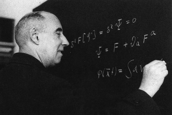 from this blog: When he became older, Stueckelberg was increasingly mentally disordered. He had a dog which attended his lectures, and when Stueckelberg ran into difficulties performing his calculations on the blackboard, he began to discuss the subject with his dog. He was treated later with electroshocks, which was a very popular method in psychiatry at that time. One might differ here a bit. One can see it as comedy. Actually, the idea of talking to a dog is a creative comical breakthrough which has been copied later: see Green's Elegant universe TV show of NOVA. It could well be that Brian Greene (or one of the script writers behind that scene) were inspired by Stueckelberg, talking to his dog. |