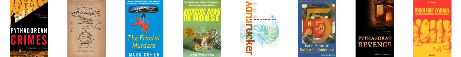 ![]() Tefcros Michaelides, Pythagorean Crimes: A thriller about a mystery murder committed for mathematical reasons. Features the international Congress of Mathematicians in 1900. |
