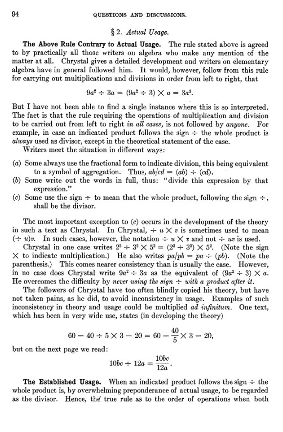 in 1928-29, "If an arithmetical or algebraical term contains / and x, there is at present no agreement as to which
