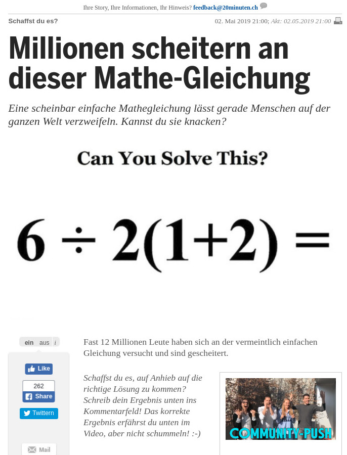 Considering it is simply a/bc, it would be interesting to dig up Florian Cajori and ask him how something so simple is causing so much mayhem ! The psychology department at Harvard need it as spring semester homework , I'm sure they have calculators for the maths bit, even though the calculators will come up with two answers. yes, Cajori got it right 100 years ago. And yes, calculators often do not agree as the video of Winklmaier Link (MOV) showed. And, yes, the subject relates with psychology and human nature. Language is a tool to communicate and sometimes requires clarity. It needs redundancy if clarity can not be enforced. This is also the case for mathematical languages. It is good to have redundant structures and the possibility to do error correction. Errors especially happen if one has pre-existing conceptions or definitions that differ for sender and receiver. This happens so often, especially also in non-mathematical contexts like social issues or politics. In our modern world, some words trigger strong reactions even if they are defined. Also, and that is also psychological or pedagogical, we humans are quite simple creatures. Teaching complex rules which seem elegant or correct and unambiguous for some elite is futile. One sees especially on the academic side a push to to enforce language to the general public. There was once an effort in Germany to simply the German language by removing capitalization for example. Maybe one can say that language also has "momentum". One can only slowly change it. The same is with mathematical structures.2/28/2025: Dark Angel writes: