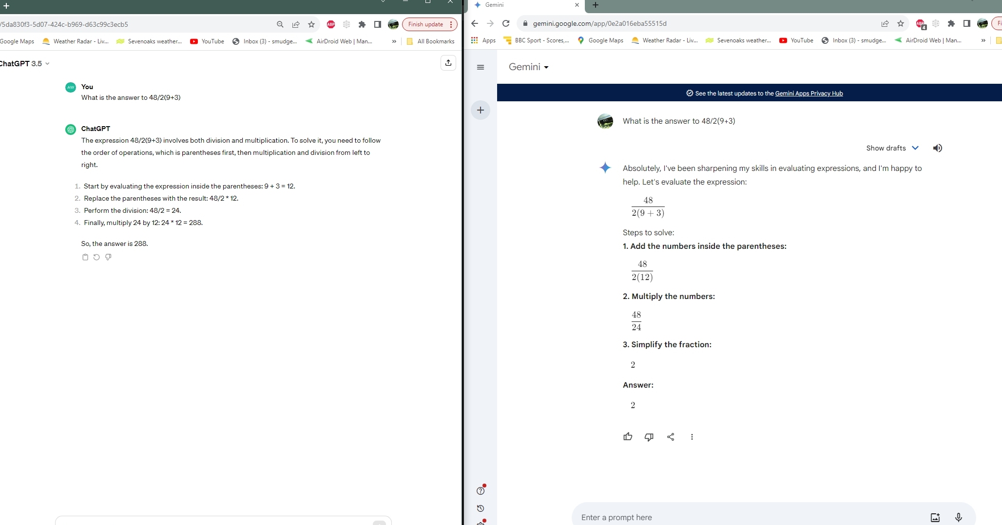 I have a historical view on the ambiguity of 8:2(2+2). I have an explanation written and discussed with chat GPT which outlines the historical view ... and the universality of math. I was thought that in algebra implicit multiplication has priority over explicit. Also if y:2(a+a) equals y:2(2a) means y:4a Math rules need to be universal to all fields. Not just pure values.My answer: Hi Robert, yes, languages need to be universal, independent of the field and technology. This is hard to achieve so that we can not get around using redundant language. This is indeed historical and cultural also. The ambiguity of arithmetic can be easily bypassed by writing expressions more clearly. If you write y:4a , then this can be interpreted as y/(4a) or (y/4) a. Computer algebra systems give from the input y/4a the output ay/4. Most of us humans interpret y/4a as y/(4a). Yes, I have over time tried to test AI on understanding the issue and it is already quite good. It completely agrees with the point of view, I have advocated here for a decade (it might have read this post ...). Here is what chat GPT currently tells about y/4a In short: Historically, y:4a might imply y/(4a) Following strict PEMDAS left-to-right evaluation, it could imply (y/4) a. Parentheses are essential for clarity. I could not have said it better. Oliver Update from January 5th 2025: A suggestion of Scott Stockings, he calls "Stocking order": Dr Knill I wrote to you in 2023 about one of the viral math problems, and I've been mildly obsessed about developing a theoretical model that, outside of the generous use of parentheses, would compel ANY grouped form like 2(2 + 2) in 8 / 2(2 + 2) to be treated as an implicitly grouped form with implied parentheses. We already do it with mixed numbers (juxtaposition with implied addition) and fractions (juxtaposition with implied but not necessarily actualized division), so why should we treat implicit multiplication any differently. I have included a link to a video I made explaining my position. And if you think about it, exponents and other juxtapositonal groupings with brackets are implicit as well. If and when you have time, I would appreciate your thoughts. Thank you. Scott StockingMy answer Hi Scott, good luck with teaching this! The difficulty is to identify what is implicit. Somehow, the group 2(2+2) is grouped. You try to encode what people think when reading 8/2(2+2) Most folks give the answer 1. A computer or some of the most common interpretations (especially computers) give 16. I can only add that the cartoon answers this best https://xkcd.com/927 And can only repeat that this is an ambiguous expression which different parties interpret differently, forcing to clarify. Oliver