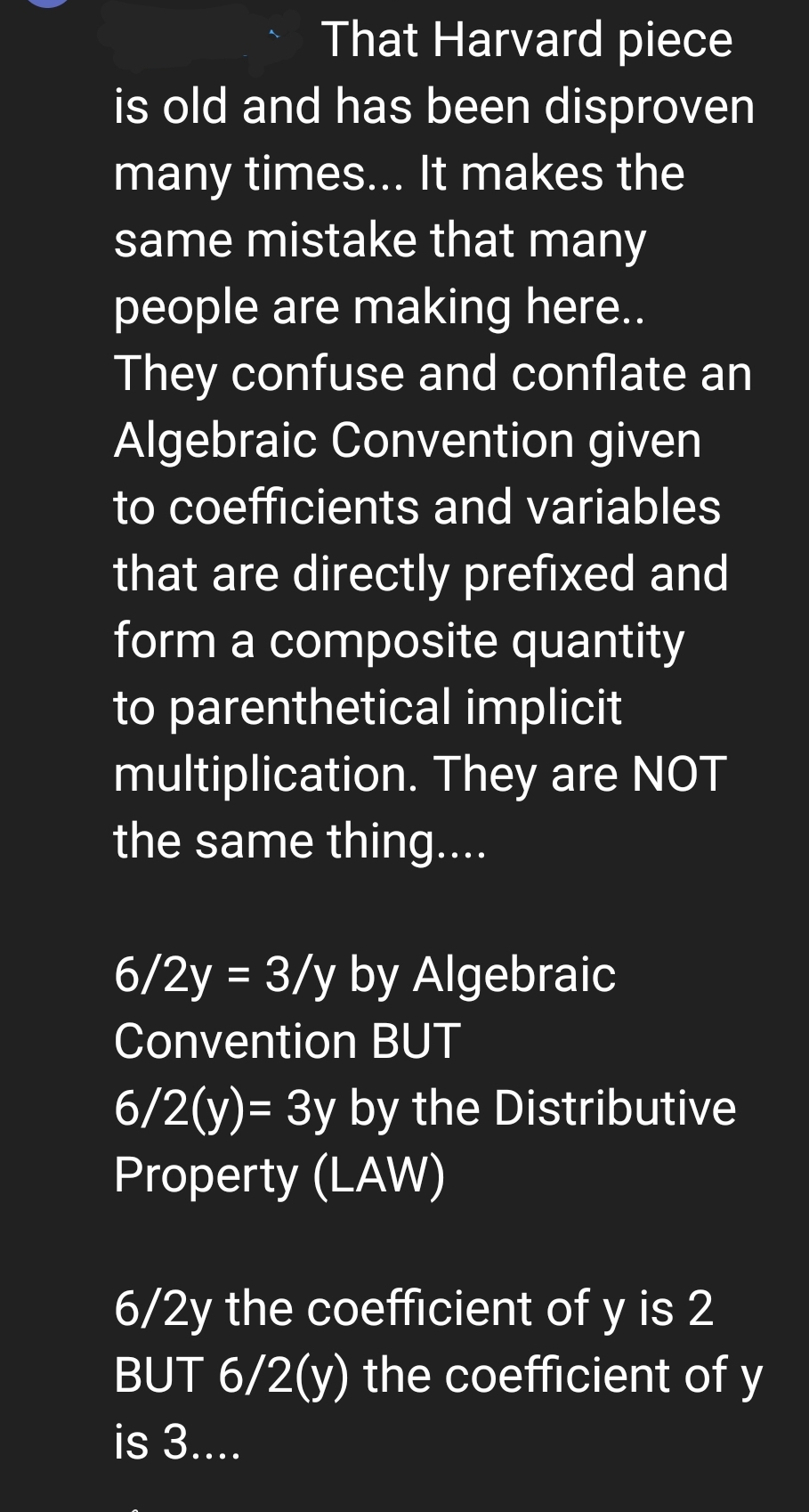 A potential solution for this controversy could be that when you have coefficients and variables written together without operators between them, e.g. 5ab, we should be able to treat this as a nested operation. In other words, the lack of an operator symbol implies that the relationship between them takes precedence over any operations outside, i.e. 5ab represents (5 * a * b). So if you had a / bc, there is only one operator written (the division symbol), and the "bc" part would be implied to be nested because of the omission of the operator within. So it would still be "a over bc," exactly what it looks like and how many of us were taught. And then if we need to signify that the operation between a and b actually takes precedence over the relationship between b and c, then we would just write a / b * c instead. No fuss, no muss. Isn't that a much more efficient way of communicating with the mathematical language here? And isn't that the point of a mathematical language, to communicate concepts effectively? Otherwise this kind of confusion will never go away, and we will have to write a lot more parentheses in our equations (and nobody wants to do that). Some people like the "new math" of the super strict PEMDAS interpretation specifically because it is an easy way to trick people and make the math more convoluted than it needs to be. Yet that seems to defeat the entire point of why we do this stuff in the first place. I get both ways of doing it, but the strict PEMDAS method seems counterproductive because it causes so many problems, and it does things like making an ostensibly simple fraction like 2x / 3y into actually meaning 2xy / 3 instead, which seems completely insane. But if instead we just use PEMDAS when the operators are actually written, then all of these kinds of problems would literally vanish overnight. The "old math" and the "new math" would finally agree, and we could accomplish it all with one very simple rule. What do you think about that?I wrote back