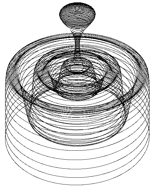 r[t_]:={{4*t*(300/(t+1)^7+1) Sin[(200/(t+1)^3+1)*8t], 4*t*(300/(t+1)^7+1) Cos[(200/(t+1)^3+1)*8t], (7/Sqrt[t+1]+1)^2(5-2*t Sin[t/10]^2 Cos[t/9]^2)}