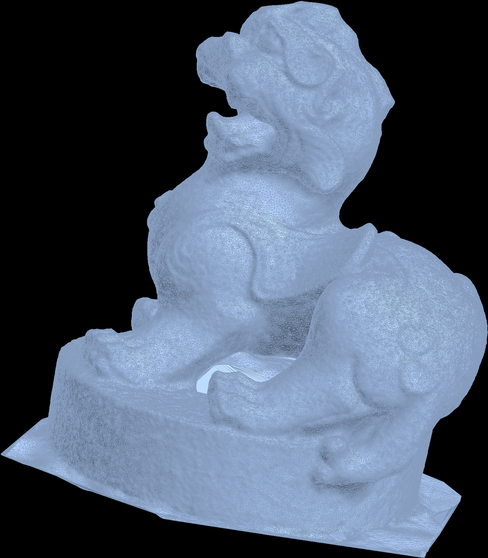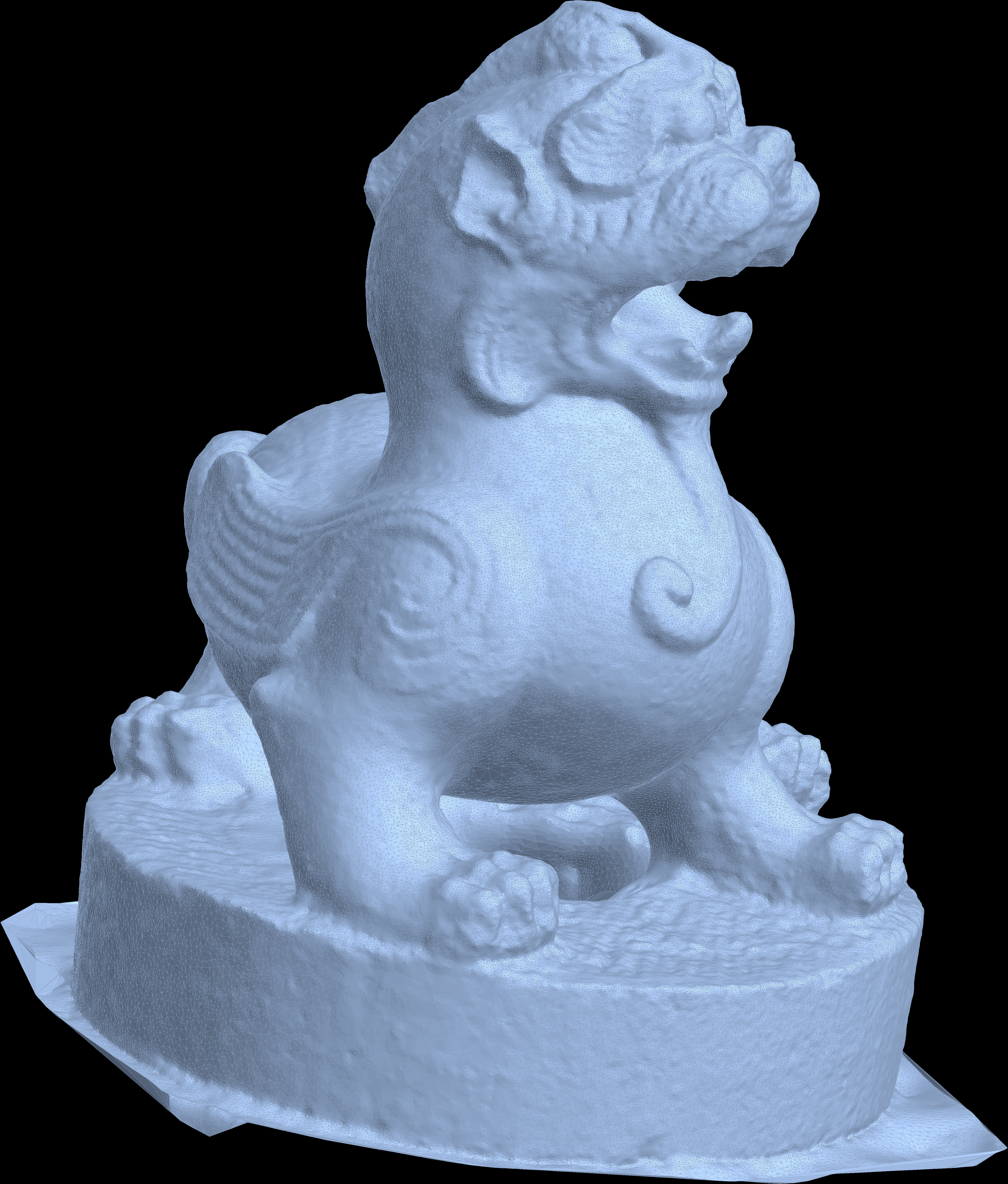 cleaned up a bit with meshlab, then imported into Mathematica: here are the 3D files: Chimera PLY| Texture 1 JPG| Texture 2 JPG| Texture 3 JPG | ZIP file with OBJ, MTL and Textures| Chimera STL (for 3D printing)| Preview the STL file using WebGL| In Shapeways. The Chimera was used as a tomb guardian in China. It rested on top of a tall pillar leading to the tomb of a member of one of the ruling families at Nanjing. It was created during the years 475-524 and is so 1500 years old. Update: January 14, 2016: First the picture from the museum, then a printout from Shapeways and finally a much simplified mesh colored: click for a larger picture.