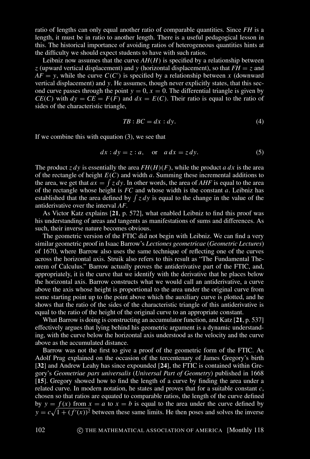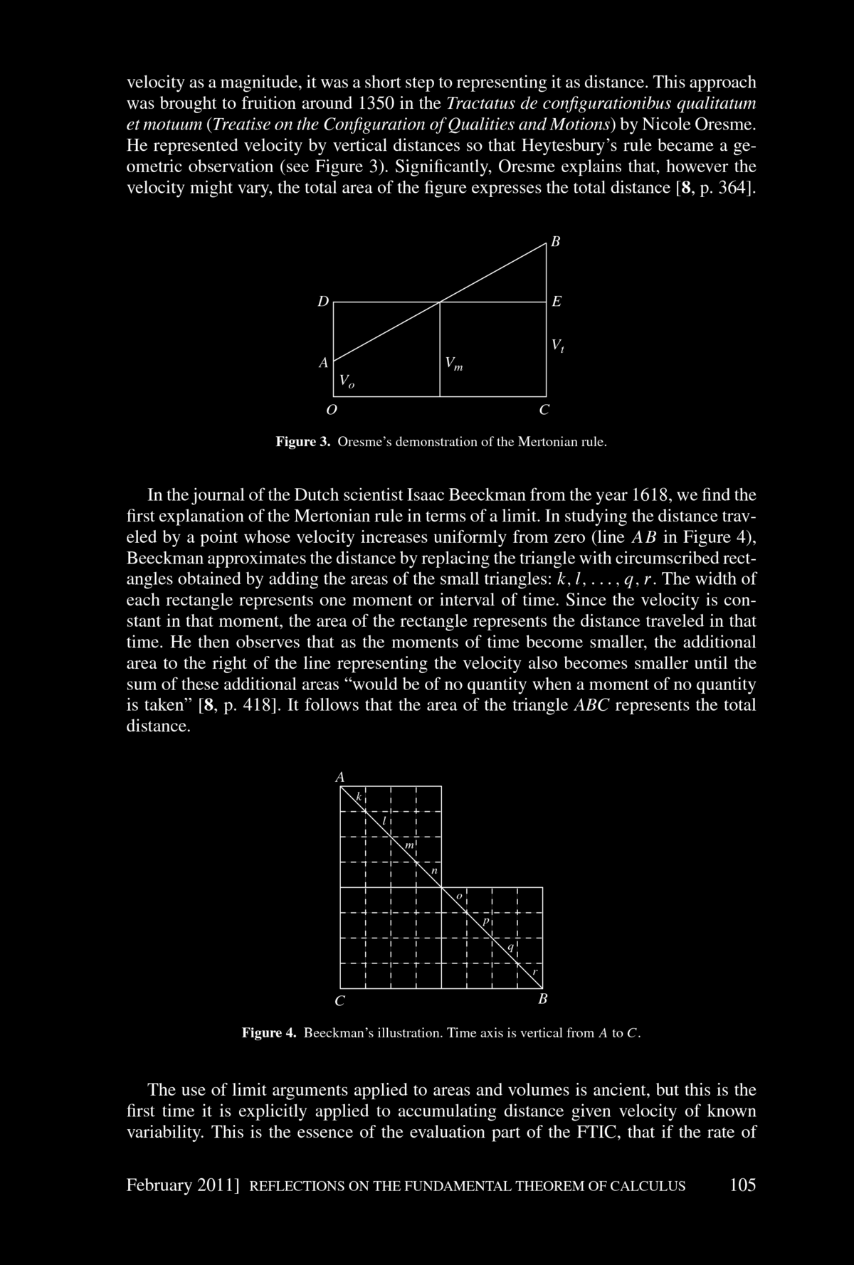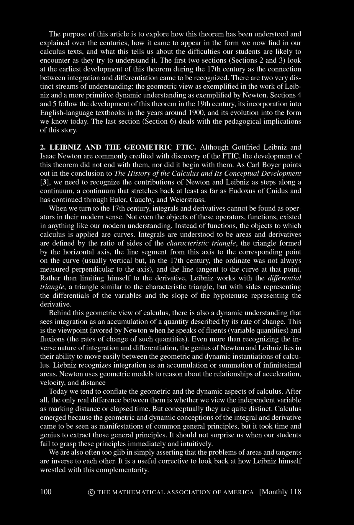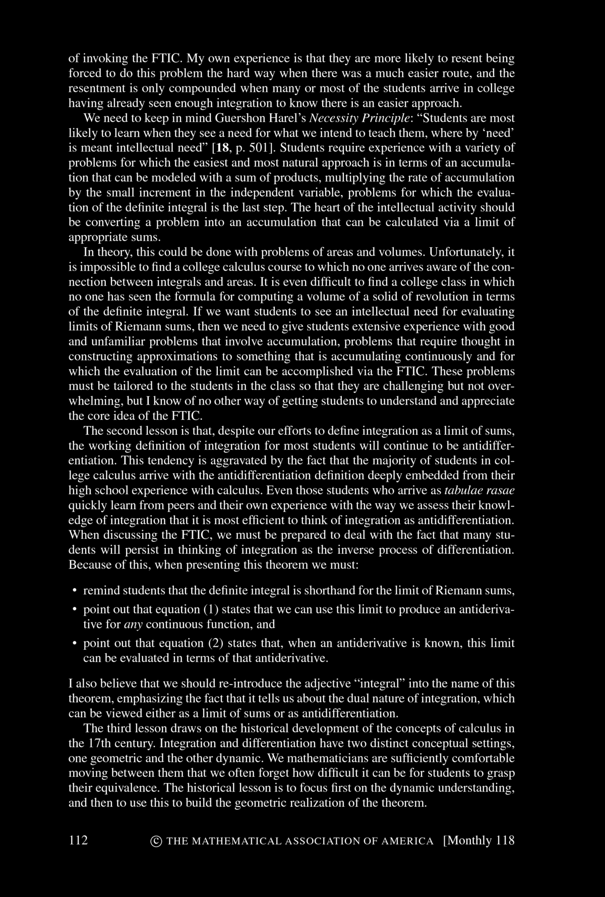 Patrick Thompson, Marilyn Carlson, and others have explored the pedagogical obstacles that students must overcome before they can comprehend the dynamic FTIC. The very first step is to understand functions as descriptions of covarying relationships. Most students think of functions as static objects, either algebraic expressions--in Thompson's words, as "a short expression on the left and a long expression on the right, separated by an equal sign" --or as the geometric object that is the graph of the function. We can not expect students to comprehend the dynamic view of the FTIC unless they are able to see functions as describing a dynamic relationship between covarying quantities. Understanding covariation is only the first step toward the FTIC. Next comes accumulation. We would do well to require our students to formulate their own explanations of the Mertonian rule. Accumulation is hard. A recent article in Science describes a survey of graduate students at MIT, students with undergraduate degrees in economics or the sciences and thus who had studied calculus, who were asked to explain the behavior of an accumulation function when a nonconstant rate of accumulation was specified. Even these students had difficulty with this task. The next step is to consider the rate of change of the accumulation function. Rate of change is already a difficult concept. Compounding this with an accumulator makes it all the more difficult. But once all of these pieces are in place and are understood, the FTIC is virtually self-evident. Newton never proves it. He simply observes that, of course, the rate of change of the accumulated quantity is the rate at which that quantity is accumulating. Calculus emerges from the awareness of the power of this observation.