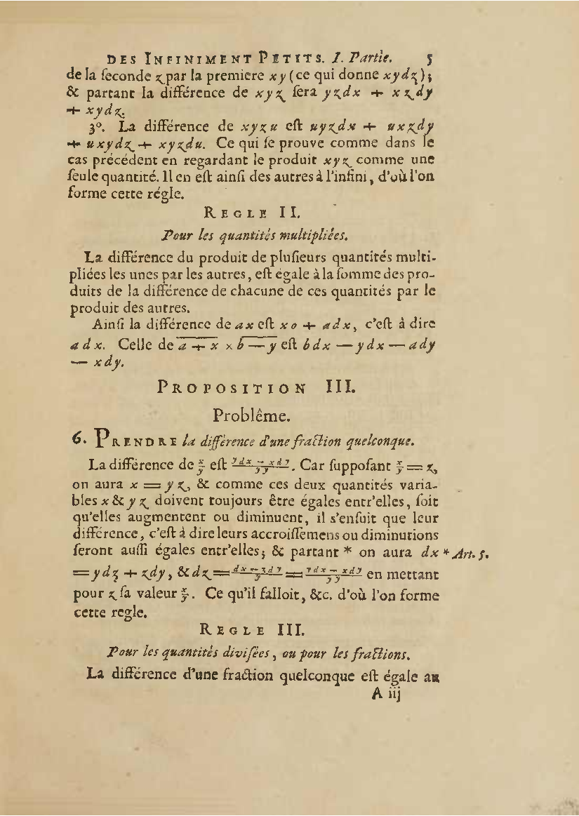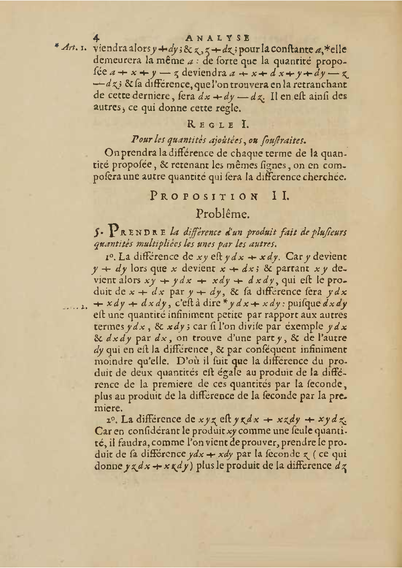 Analyse des infiniment petits, pour l'intelligence des lignes courbes Par Mr le Marquis de L'Hospital. L'analyse qu'on explique dans cet ouvrage, suppose la commune; mais elle en effort differente. L'analyse ordinaire ne traite que des grandeurs finies : celle-ci penetre jusque dans l'infini meme. Elle compare les differences infiniment petites des grandeurs finies; uelle decouvre les rapports de ces differences et par la elle fait connoitre ceux des grandeurs finies, qui comparers avec ccs infinimeurs petits font comme aucanc d'infinis. On peut meme dire que dire que cette Analyse s'etend au-dela de l'infini: car elle ne se borne pas aux differences infiniment pecites ; mais elle decouvre les rapporcts des differences de ces differences, ceux encore des differences troisiemes, quatriemes et ainsi de suite, sans trouver jamais de terme qui qui puisse arreter. De forte qu elle n'embrasse pas seulement l'infini; mais l'infini de l'infini, ou donc infinite d'infinis. PDF (I removed some empty pages from the source). |