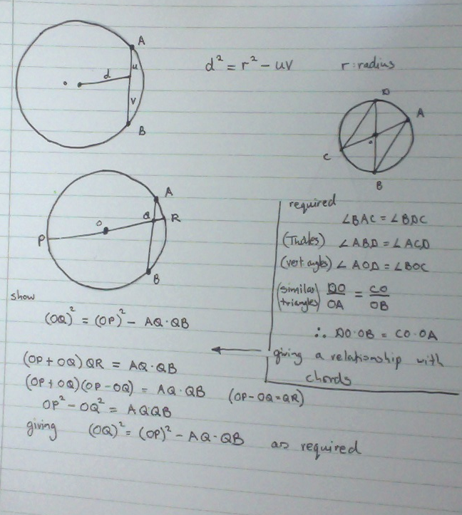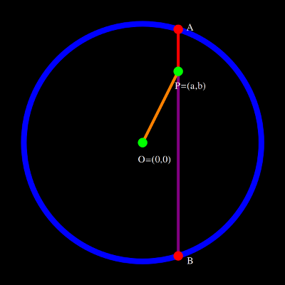 1-|PO|2 = |PA| |PB|The proof is done by brute force using Descartes idea of using coordinates. P=(a,b) A=(a, (1-a2)1/2) B=(a,-(1-a2)1/2) |PA| |PB| = ((1-a2)1/2-b) ((1-a2)1/2+b) = -b2+1-a2 = 1-|PO|2Questions: