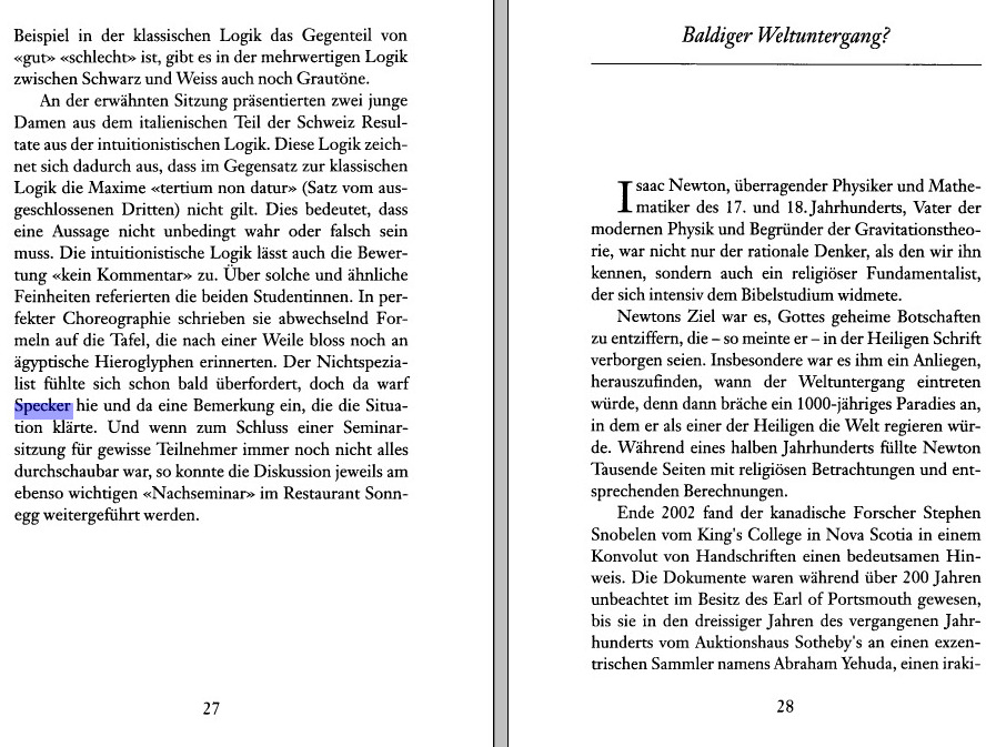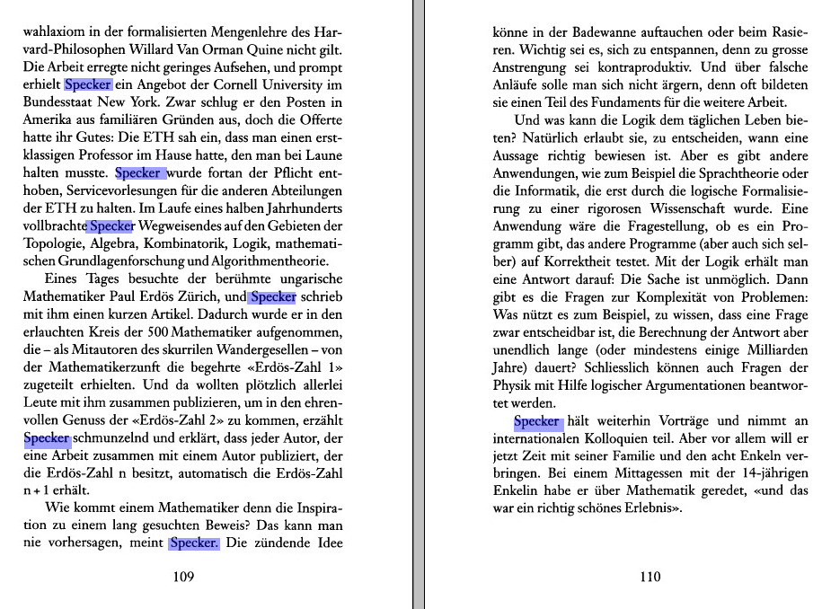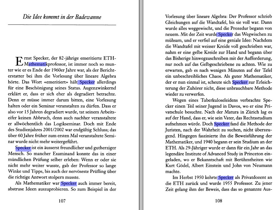 While preparing for the Set and Logic lecture, I found in a logic book the following article about Specker in the NZZ. Specker is probably best known for the Kochen-Specker theorem, which is also of great interest to a general public as it deals with a fundamental property of quantum mechanics. See Section 218 in my current list of fundamental theorems.- My Boston Talk of 2015 mentions a story about Specker (also my Lin alg teacher at ETH) and Läuchli (also my analysis I,II (calculus) teacher at ETHZ). (see a list of courses. Specker liked to play with the class or challenge it with riddles. Here is a page on an assignment to write down the definition of the smallest 10 dimensional vector space.