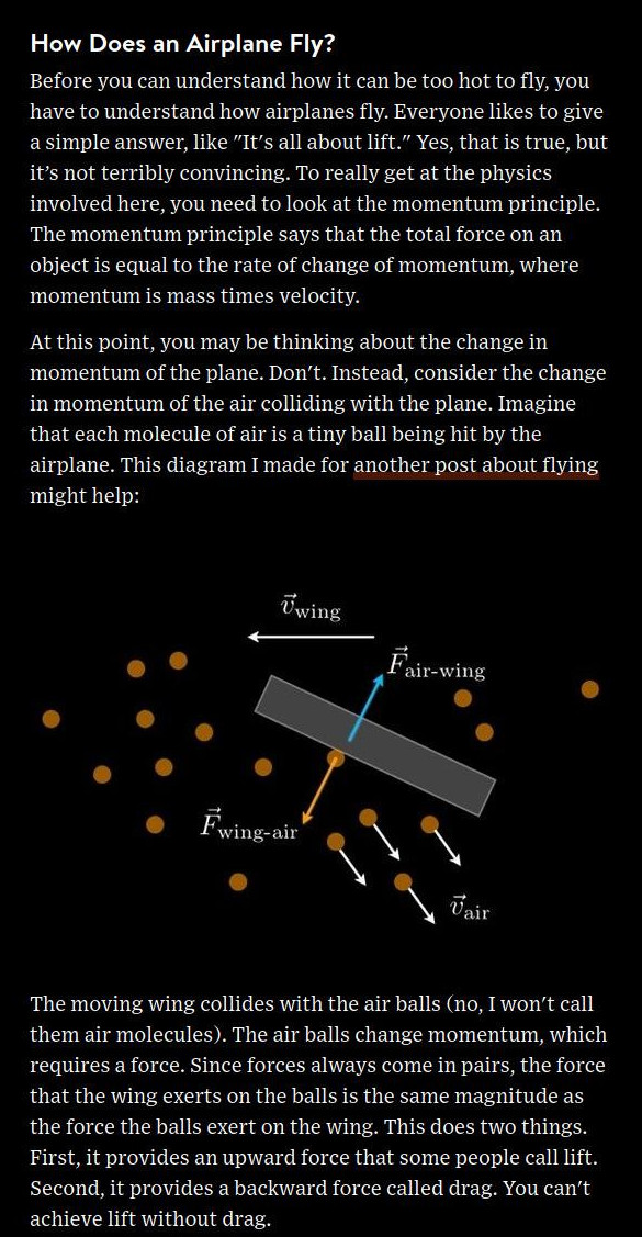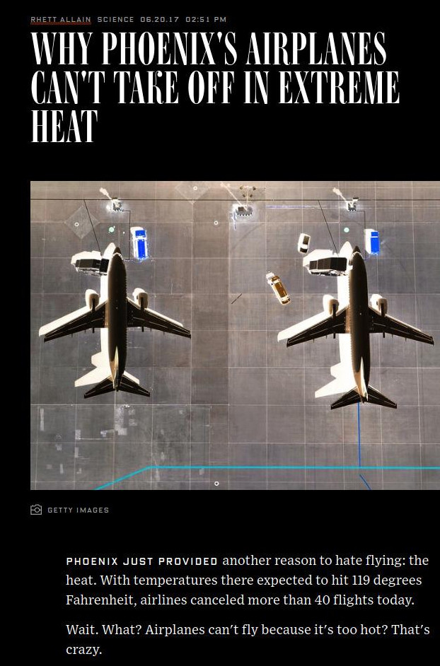 This june, it had been too hot in Phoenix to fly. Reports were everywhere, like in BBC or Salon. Also the physics got discussed, like in Wired: Phoenix airplanes. Heat produces a drop of air density so that there is less momentum change contributing to the lift. Multivariable in action.