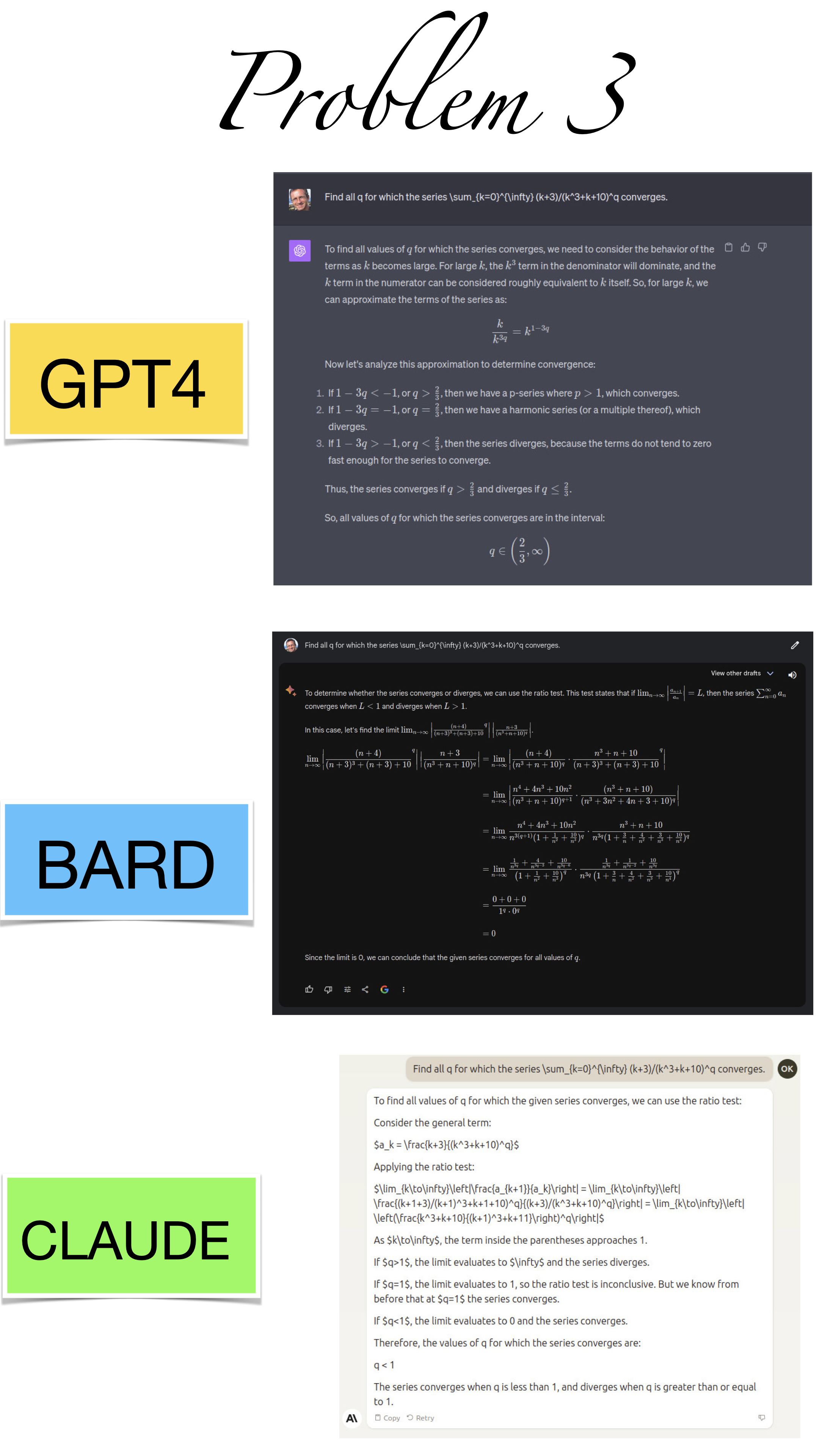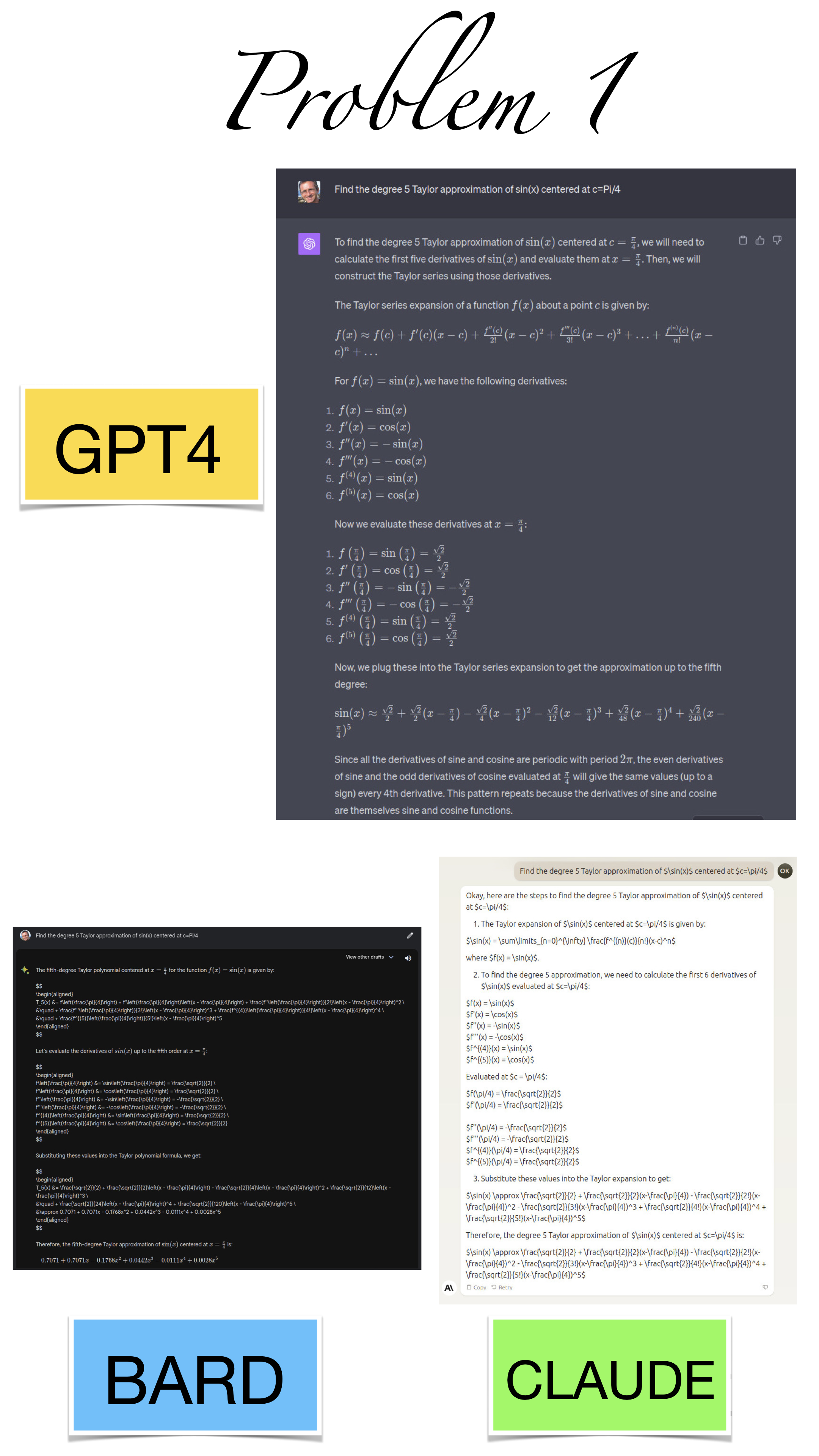 | Here are the pictures of the 1 minute short done before the second midterm in Math 1b. Three bots, GPT4, BARD, CLAUDE competed. I made a 35 frame slide show for that. The 1 minute short contains also the output captured from what the bots told. It can be inspected more closely here. Click onto a slide to see it large. |