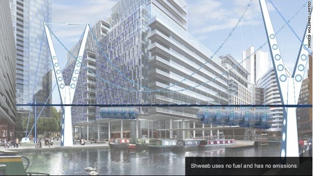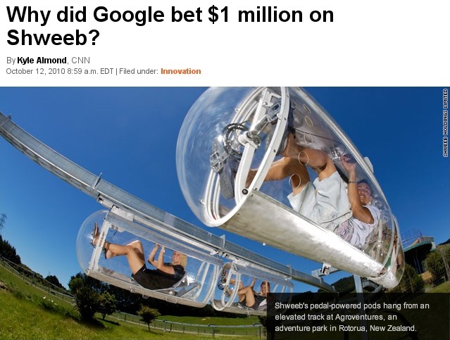 | Added October 12, 2010: CNN article presents Schweeb's pedal powered pods. It is a great idea. The pictures look similar to this picture but a central idea is to let the passenger pedal. It merges biking with an areal tramway idea. |