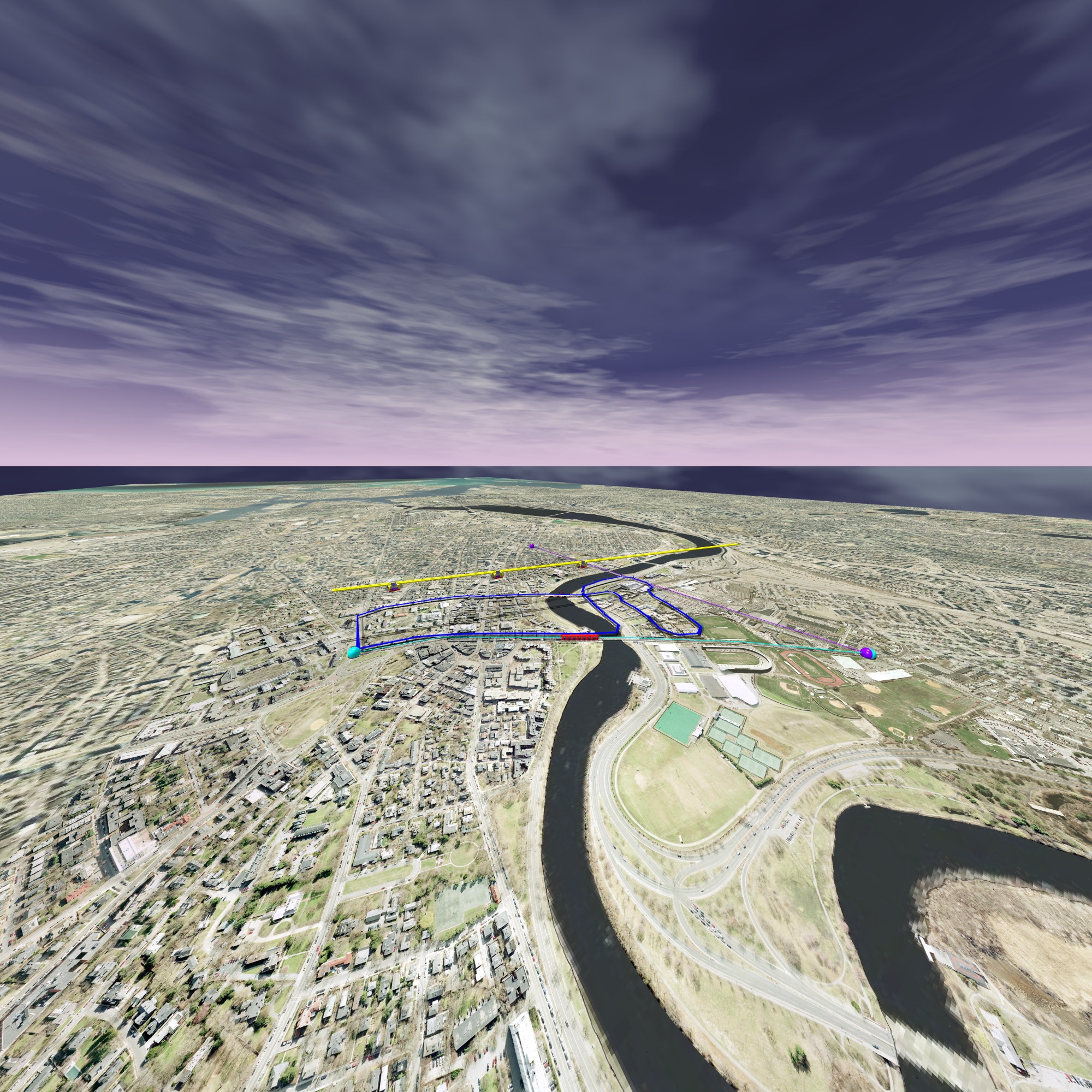 | Train or trolley lines could use existing streets or existing bridges. A futuristic cable-car solution has the advantage to be completely decoupled from the street traffic. Also a monorail solution could be constructed above the current car lanes. Special bicycle paths could be implemented right away. For bikers, it is important that they do not have to cross big streets, nor pass close to parked cars. Bicycle paths along existing streets are dangerous. A bicycle bridge over Memorial drive would be a first step. Alternatively, Memorial drive could be lowered into the ground near Harvard campus. |
