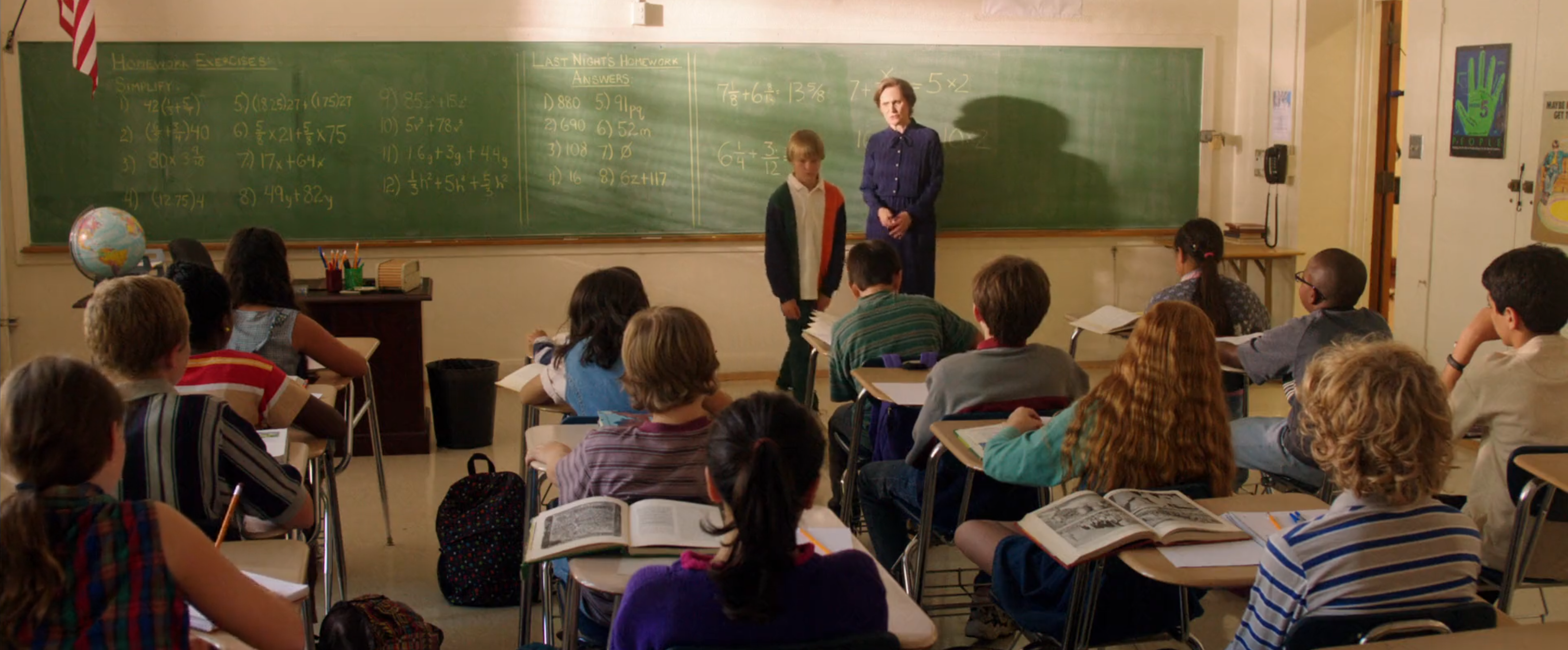 There are two short math scenes in that movie. By the way, a movie which is highly recommended. One knows Seann William Scott of course from movies like American Pie (Stiffler), Oldschool (a very short scene as a farmer with the tranquelizer gun) or the MTV music awards (the spoof of the matrix is great, a shitload of stifflers). Here, in this a bit darker but uplifting commedy, he brings a great performance, similarly than Steve Carell's great performance in Little Miss Sunshine as one associated Carell of course with the ``Office". The math scene which appears in "Just before I go" is a flashback. Obviously the scene is highly staged. Different kids have books from different areas (there appears to be a greek history book on the table). The math problems given as homework (problems 1-12) on the green board are hilariously un-imaginitive.
