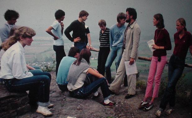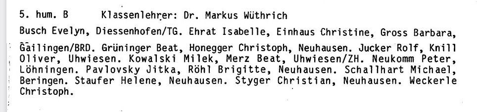 Geology excursions (the left was probably the one to the Danube Sinkhole). The right picture with a slightly exhausted class (I'm the one to the very left) was somewhere else in the south Germany part (probably in the Hegau studying the many volcanic remains there). Hanspeter Jud was a great geography teacher who would teach in themes (case method). For example, there was a theme on Borax. We would hear about how it is mined, where it is used etc. The teachers were all stellar. Werner Geissberger was also the Kanti chorus director. (I had been singing in that choir too, made even an opera production with week long training camps. The opera was Dido and Aeneas by Henry Purcell and we performed in various places in Switzerland like Lugano). The spectrum of his music theory was quite wide. From Queen (Pop) to Stockhausen (modern). Erich Hamburger taught French. We always had to retell what we read in French in our own words or what we have been doing recently. Huessi was for most students very scary, a huge man. I found him amusing and liked him. He would come in, have the class stand in silence for a minute, then everybody sit down, then pick a student to recite the English text we had to read for the day, by heart, verbatim! No kidding. Our Matura card See page 13, which had been done by our class, where I'm cited. Most teachers addressed us with ``Herr Knill", Huessi called the boys by last name ``Knill" and the girls by first name. Jost Schwendener made his own science experiments in the classroom. (We were awful and tempered sometimes with his data by messing with his plants, mealworms (larvae of a beetle) which must have been one of his specialities and equipment before class. I was cited once even before the principal for that). Math teacher Roland Staerk was extremely inspiring. Physics with Wahlen was quite advanced. He even tried to cover differential equations before we had been exposed to calculus. Jürg Zimmermann is a gifted historian. Not on photo is Heinrich Nicolet (German), Jür Binkert (Chemistry) we got once an assignment to use the entire chemistry lab to analyze using all the tools at hand in the lab (without any other guidance) an unknown substance, it turned out to be Aspirin, Markus Wüthrich (History), Martin Eichrodt (Religion), Silvio Vanzella (Art), Klaus Weckerle (Sport), Markus Werner (Philosophy) very impressive, he came in first class asked everybodys name, there were no student facebooks etc, he saw us the first time, then he went through the class and addressed everybody by name. He would challenge us with questions why we know a color is red or why the sum of the angles of a triangle is 180 or whether our opinions are taught or acquired. Barbara Oechslin (Latin), Hanspeter Jud (Geography) The following teacher photos were taken by Peter Neukomm during our high school time. Click on a thumbnail to see a larger versions.