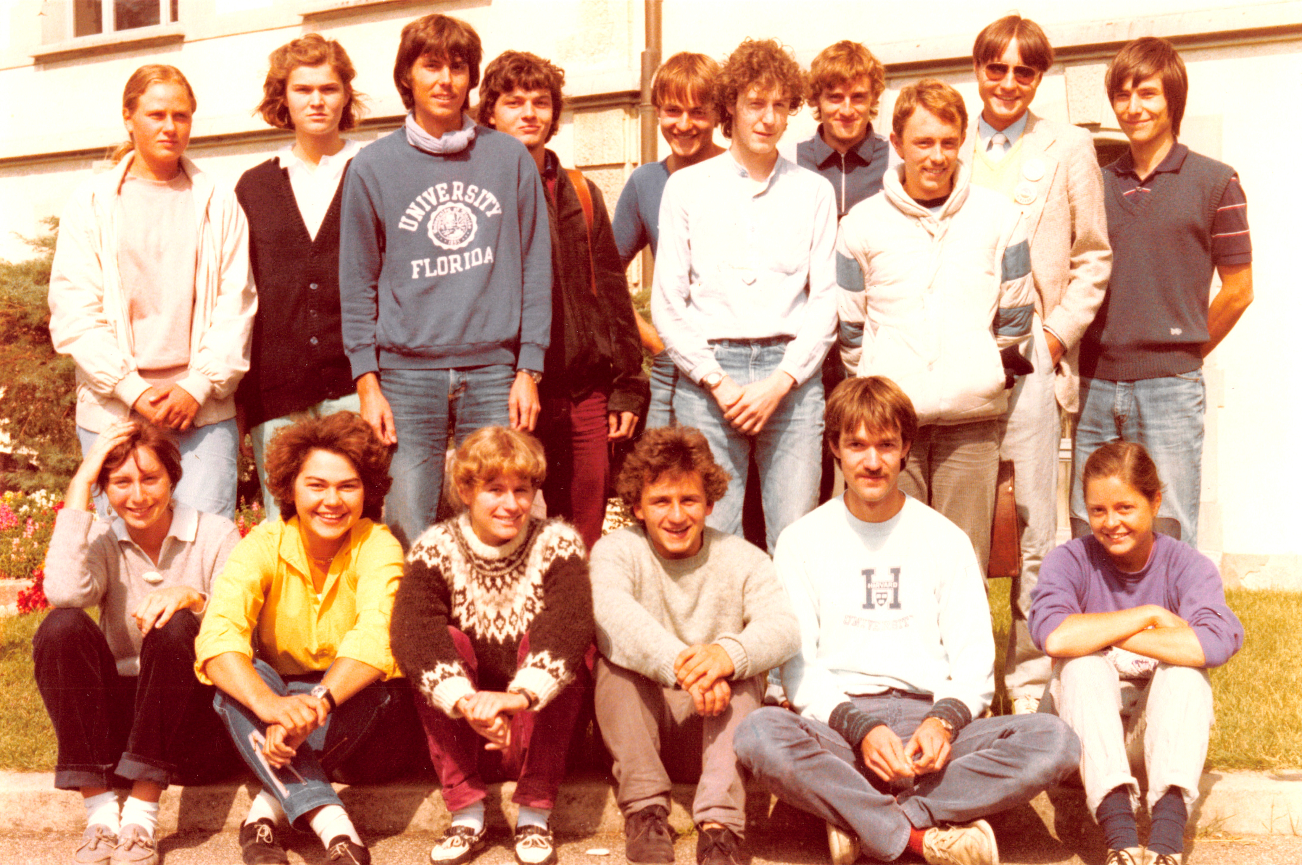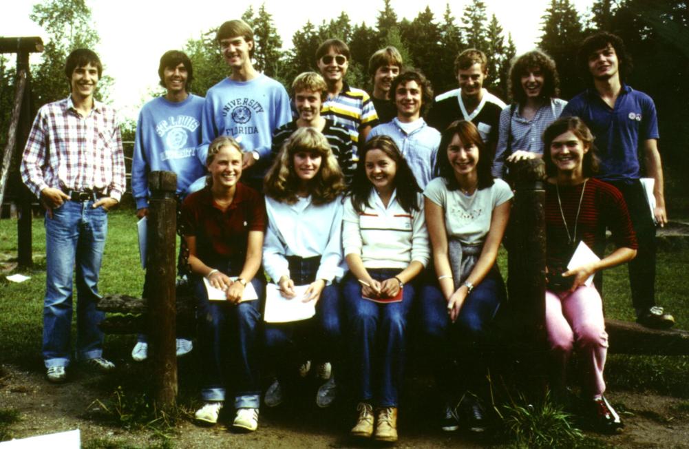 We were 17. Top Left to right: Evelyn Busch, Barbara Gross, Michael Schallhart, Christoph Weckerle, Beat Grueninger, Rolf Jucker, Christian Styger, Beat Honegger, Milek Kovalski, Peter Neukomm, Bottom Left to right: Jitka Pavlovsky, Christine Einhaus, Isabelle Ehrat, Oliver Knill, Beat Merz, Helene Staufer. The class was together all the time, all subjects except sport, where girls and boys were separated (but had also the sports class at the same time of the day). For much of the day, we had our fixed ``home" classroom and the teachers would come in and out to teach in ``this home". We would rarely mess with the teachers, as most were our teachers for the entire 5 years (I had one math teacher, one french teacher, one english teacher in high school). We would mess with substitutes however. For a temporary math substitute teacher, we once turned all our tables and chairs facing the back so that the poor fellow had to teach without the board or for an other substitute, where we took out the weights of the blackboard so that in order to write, he had to constantly hold it up). (The photo only shows 16, missing in the picture is Brigitte Roehl). If I remember correctly, the picture has been taken by our last latin teacher, Barbara Oechslin. After reading for 7 years Ovid, Caesar etc, we were taught by her in the last year to speak Latin: "Cervisiam, cervisiam, out moriar!"