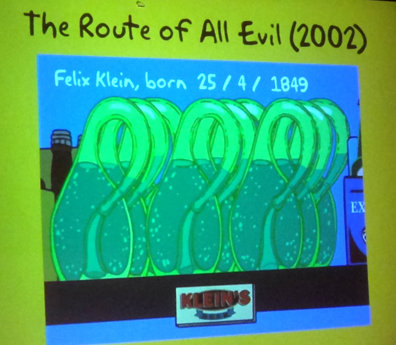 On November 4, 2014, Simon Singh, the author of the new book "The Simpsons and their mathematical Secrets" gave a talk. Here is a slide