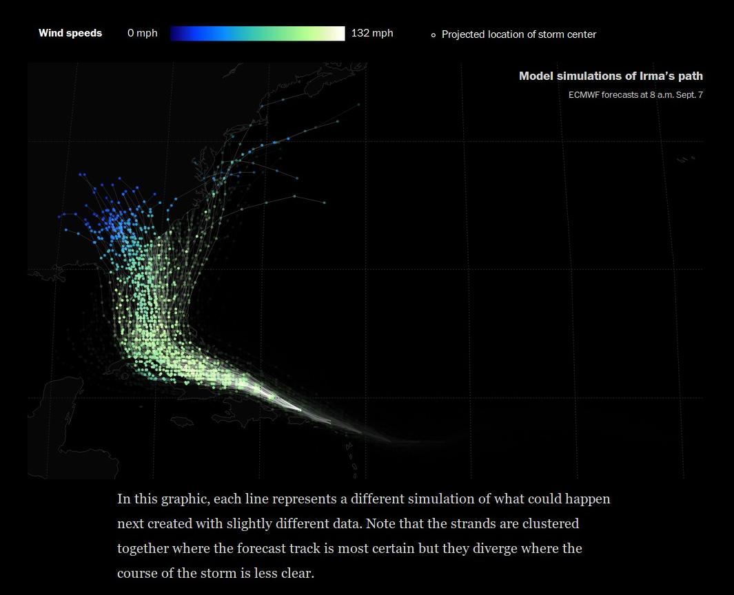 Update: September 7, 8 AM: Irma approches Florida: Washington Post coverage. Here is an info graphics from that article. There is a lot of mathematics involved: weather models using currently available data: