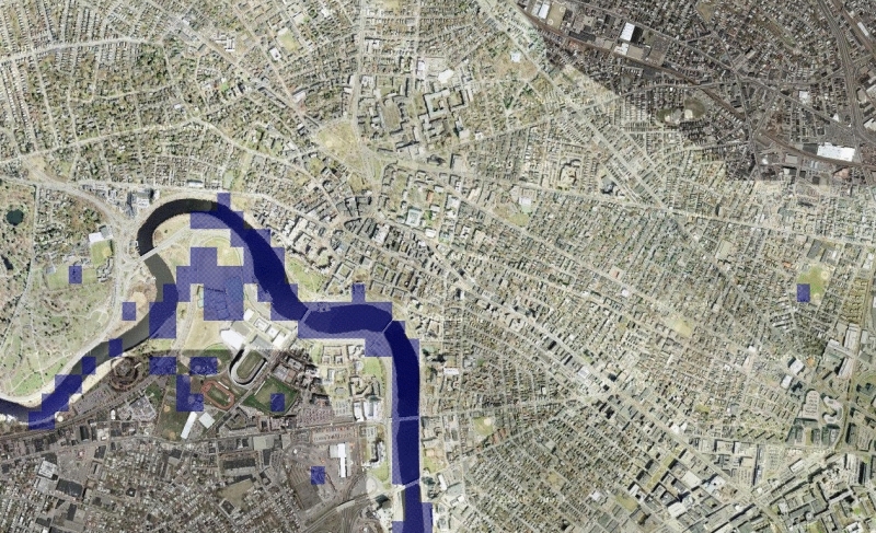 | This is how Harvard yard would look like with a sea level of 14 Meters. A google map extension allows to explore the world with higher sea levels: Charles river. Wouldn't it be nice to have a nice ocean beach right near Harvard yard? It would actually not be so nice. Much of Boston and Cambridge would be flooded. |