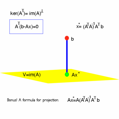 a* = (AT A)-1 AT b to this system. (The least square solution formula was obtained from AT (b-A a) = 0 which paraphrases that the "error" (b-A a) is perpendicular to the image of A. Geometrically this means that A a is the projection of b onto the image of A. ) |