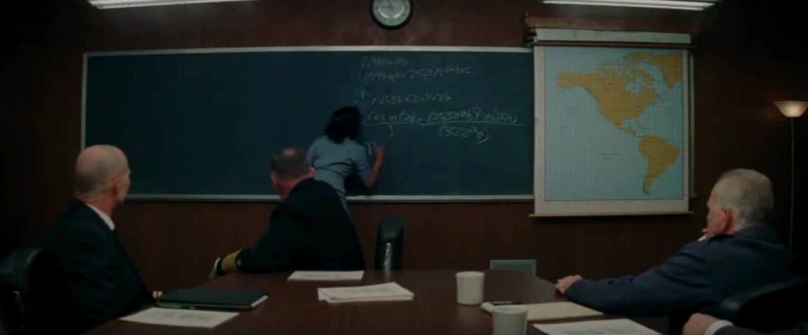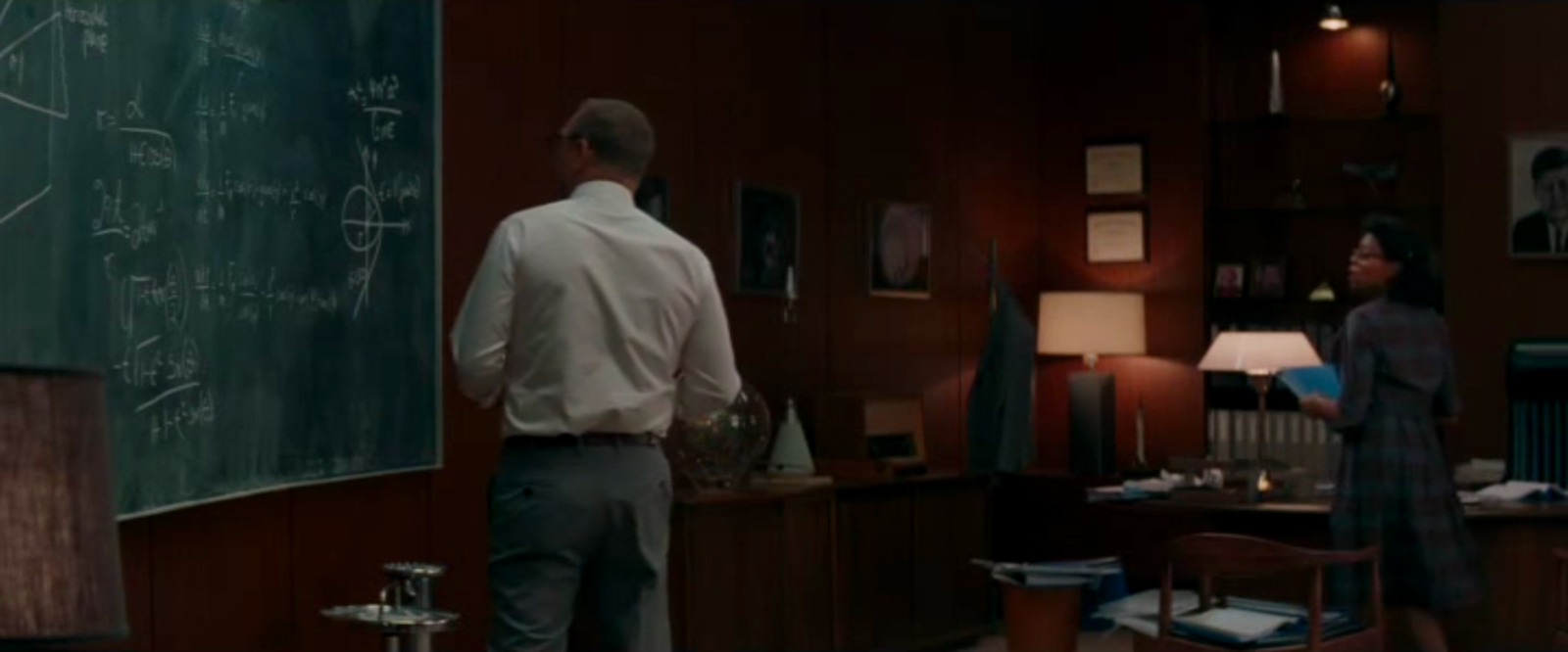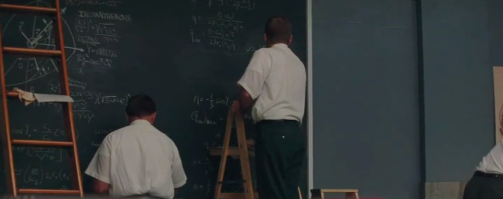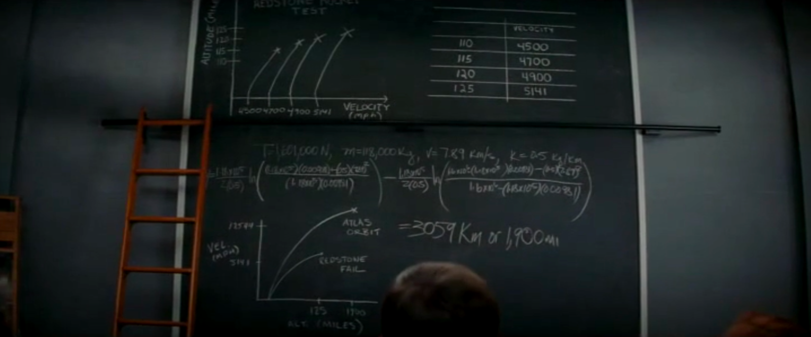 to solve differential equations. The blackboard of Al Harrison (played by Kevin Costner) features equations of conic sections like ellipses given in polar coordinates as r = α/(1+ε cos(θ))The problem of finding the trajectories of a rocket is a problem in differential equations. One equation we can see ds/dt = vr, dvr/dt = vθ2/r g(R/r)An other describes the motion in spherical coordinates (unfortunately, not all formulas are well visible): dr/dt = v sin(y) dθ/dt = v cos(y) cos(ψ)/(r cos(φ)) dφ/dt = v cos(y) sin(ψ)/r dv/dt = (1/m) Fr - g sin(y) v dy/dt = (1/m) Fm cos(y) -g cos(y) + (v2/r) cos(y) v dψ/dt = (1/m) F... sin(y) + (v2/2)They are nonlinear but we will cover some nonlinear equations also in our course. Still, the Kepler problem can actually (with some clever transformation) be reduced to a Harmonic oscillator, which is a linear ODE. We see Catherine also work on some differential equations on the large blackboard. |