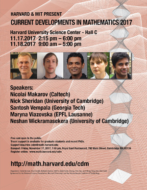 Current Developments in Mathematics 2017Friday and Saturday, Science Center, November 17-18, 2017Organized by: David Jerison, Paul Seidel, Richard Stanley (MIT), Horng-Tzer Yau, Mark Kisin, Shing-Tung Yau (Harvard) Speakers: