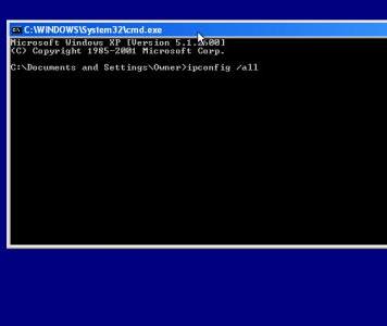 • at the prompt type ipconfig /all and hit Enter. (Note: there is a space between ipconfig and the forward slash.)