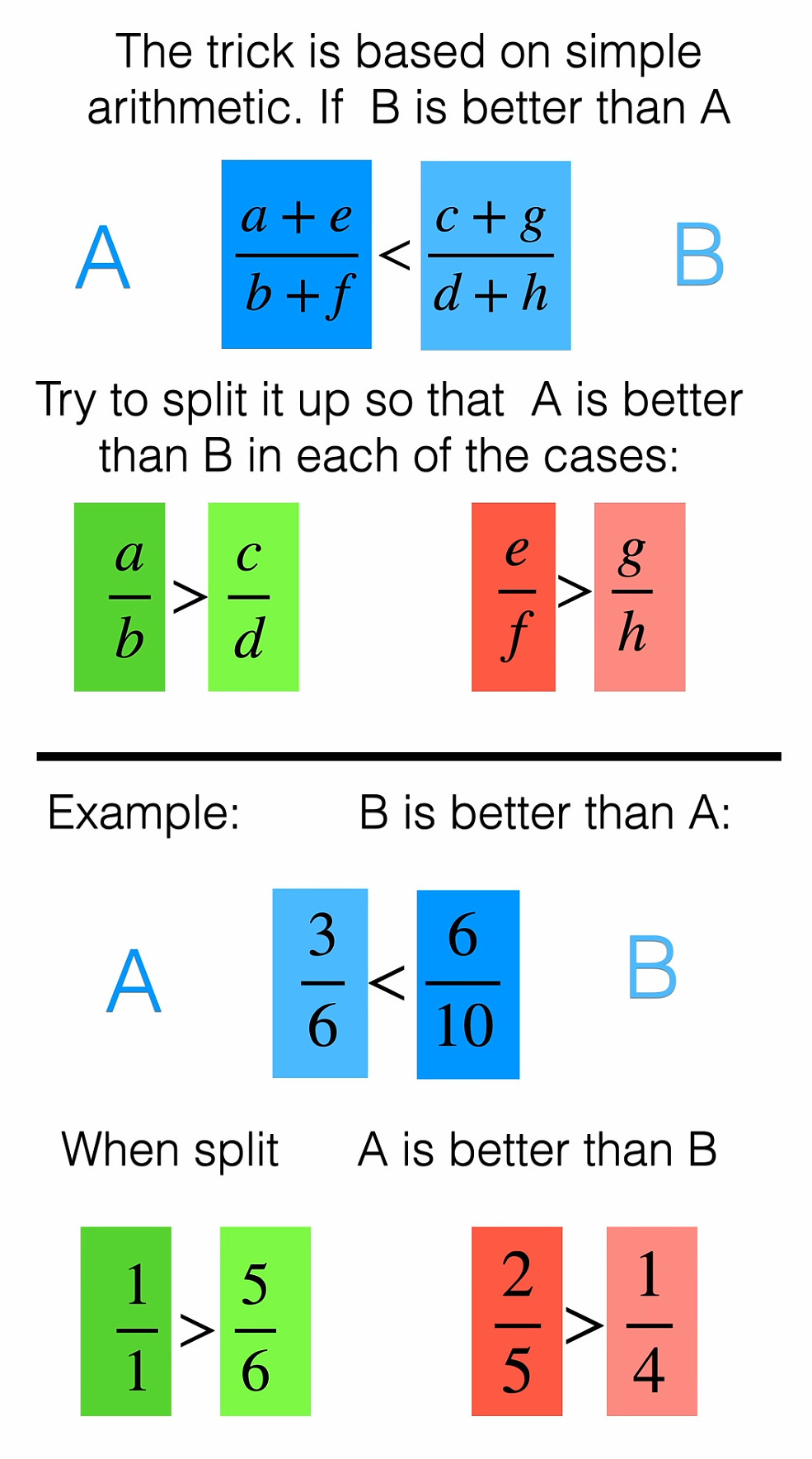 I explain it with the fact that fractions a/b > c/d and e/f > g/h can happen even so (a+e)/(b+f0) < (c+g)/(d+h)