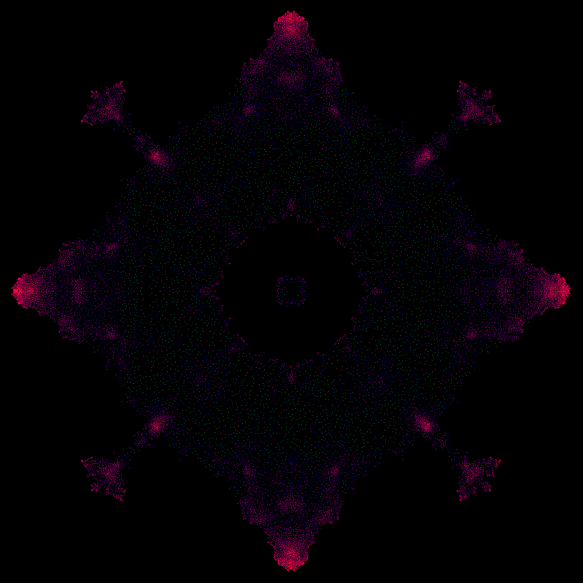 more boring. Each point is an eigenvalue. When the parameter changes in the probability space, the eigenvalues move like a swarm of 2000 particles, fighting each other under a changing external force. Eigenvalues "fear" each other. Since each eigenvalue is a hero "battling" in the complex plane, a heroic music theme has been chosen. More about this in the Mathematica project. Added October 17: the spectra seen here are expected to have a fractal structure if the matrix size goes to infinity. It was Mandelbrot, who just died who had popularized the subject of fractals. Mandelbrot had lived at 75 Cambridge street in Cambridge (pretty close to the Science museum). He had been a visiting professor at the Harvard mathematics department. Added October 31: here is a picture of the spectrum of a 30'000 x 30'000 matrix computed on Odyssee. |
