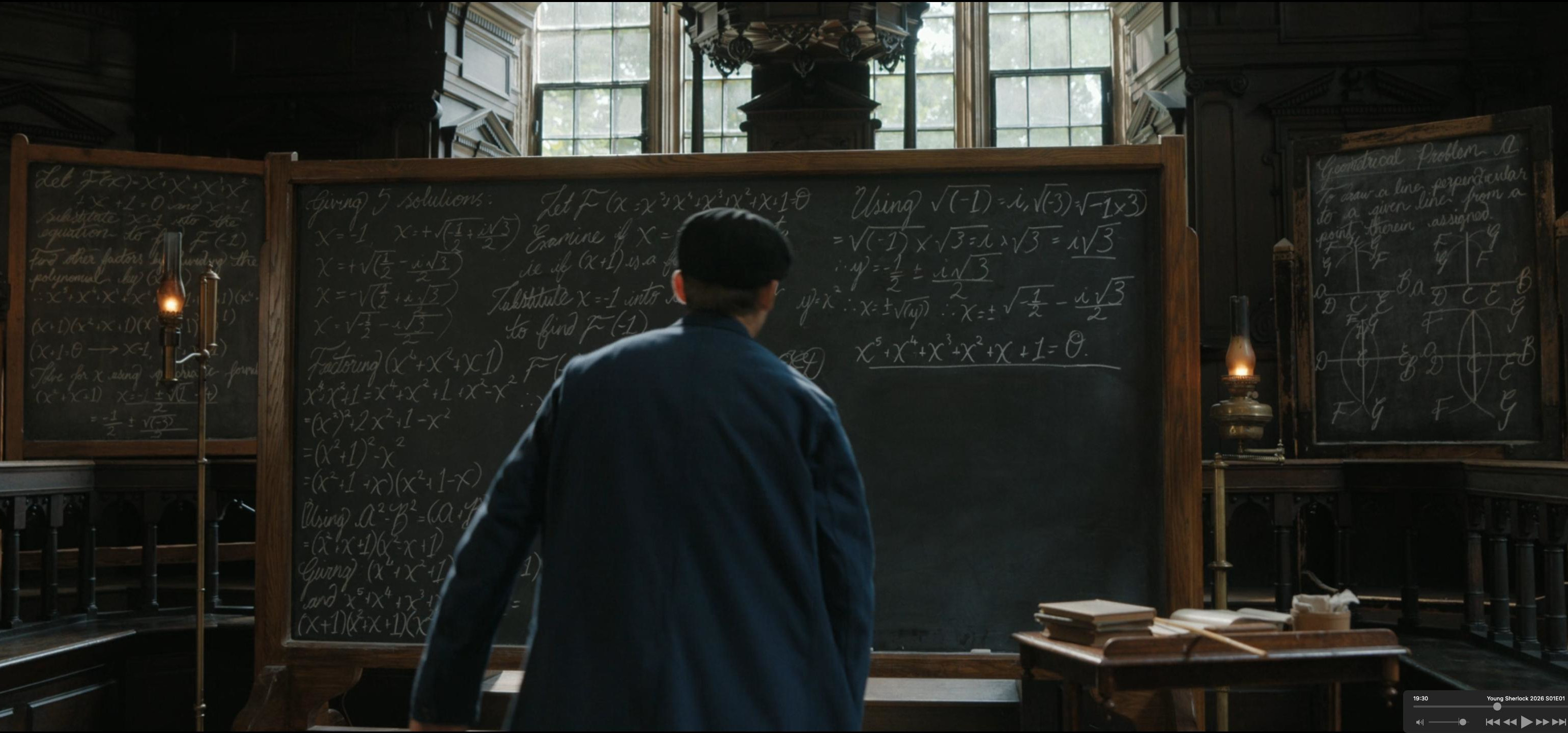 About holomorphic functions and a solution to a quintic 1+x+x^2+x^3+x^4+x^5. Thanks to Craig Smorynski for the hint: Sherlock attends a lecture on mathematics at Oxford and points out an error to the prof.